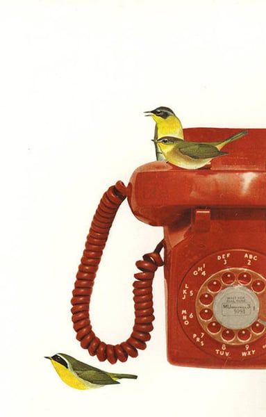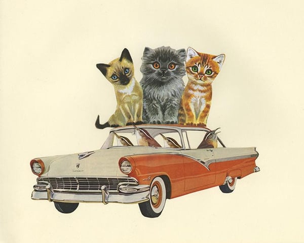 A chime of Carolina wrens make off with the whole kitten caboodle. Collage print.