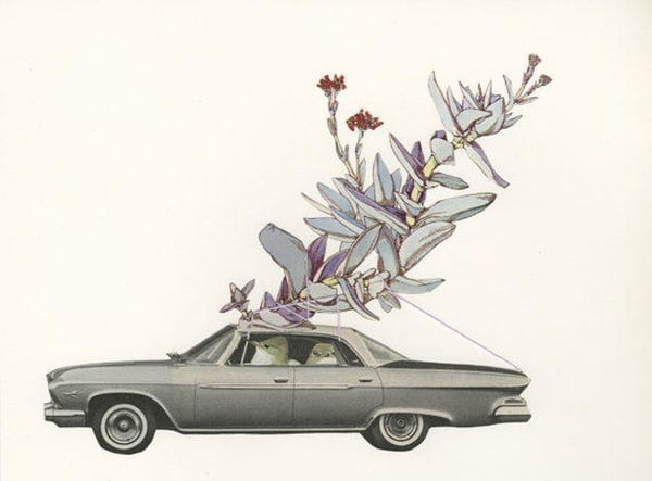 Some Arizona peckers make off with some hens and chicks. Limited edition collage print.