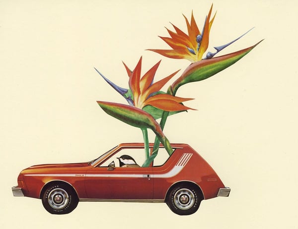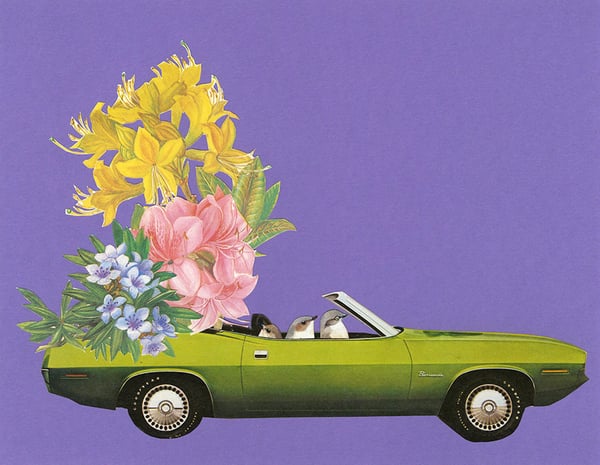 Humming along in their sweet ride. Limited edition collage print.